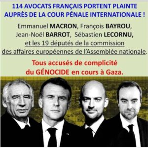 10. Utiliser le droit de porter plainte en tant que citoyen pour crimes internationaux, même si la route est longue, pour contribuer à la construction d’un dossier juridique mondial. Poursuivre les gouvernants là-bas et ici, et les complices ici [1] ,