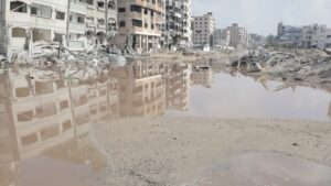 Fuites d’eaux usées dues à la destruction des réseaux d’assainissement, contaminant les nappes phréatiques et la mer Méditerranée.